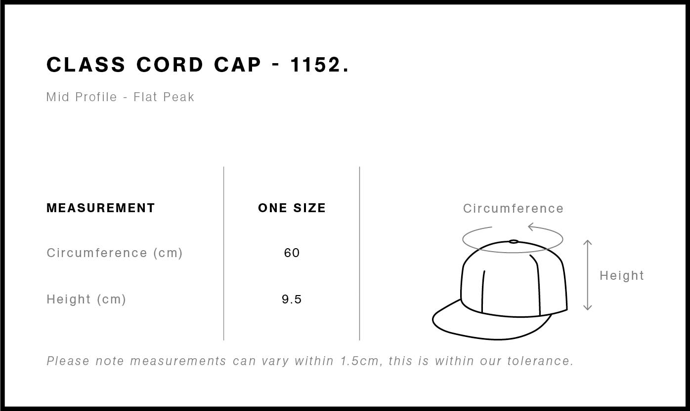 AS Colour Class Cord Cap: A mid-weight, unstructured six-panel cap crafted from 100% cotton with 8-Wale Partridge Cord. Features include a flat peak, adjustable metal clasp fastener, and tonal under-peak lining. One size fits all, complemented by a tear-out AS Colour label for personalised wear