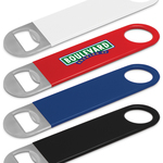 Large stainless steel bottle opener with a soft-touch vinyl coating.