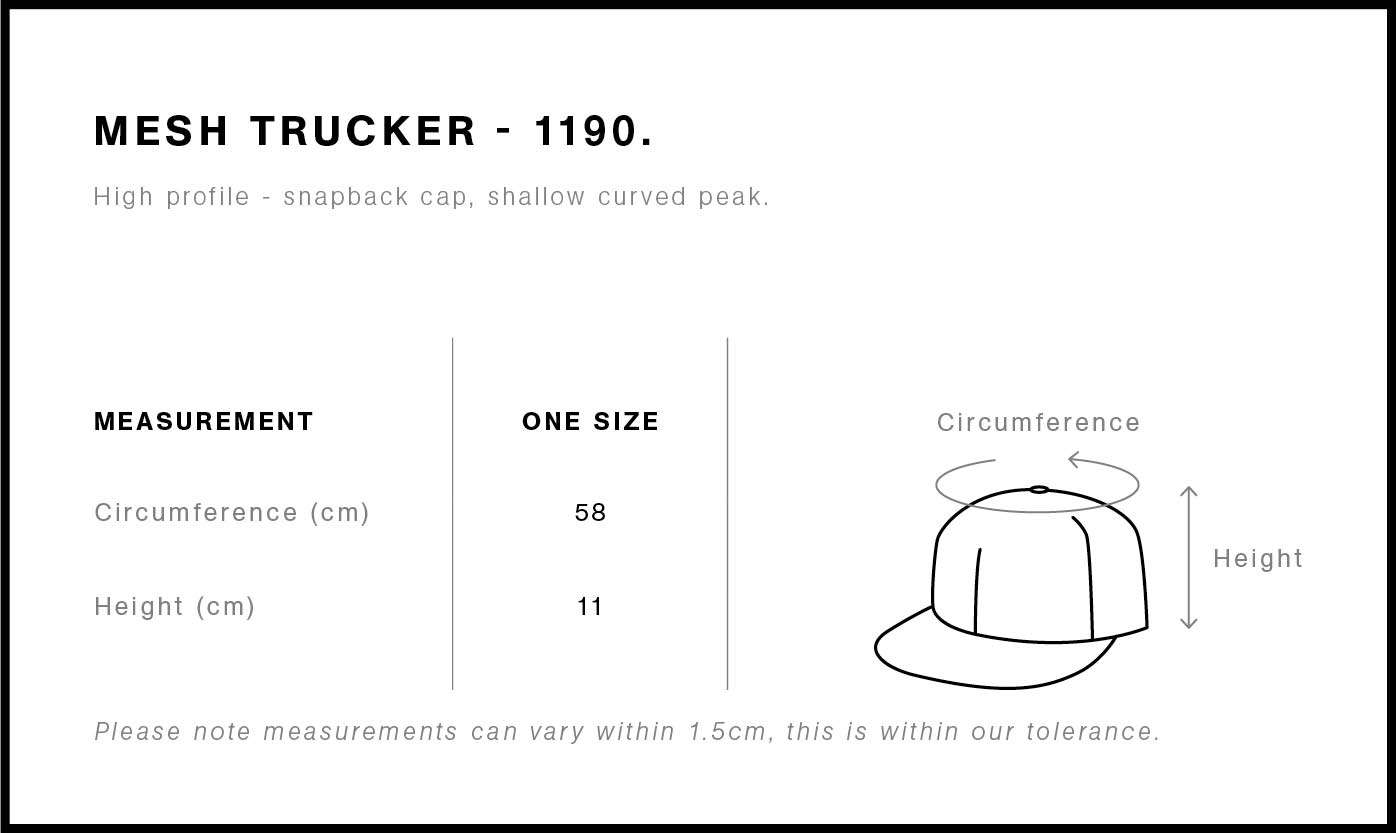 Construction: Snapback cap with shallow curved peak, tonal mesh back, plastic snapback closure, tonal under-peak lining