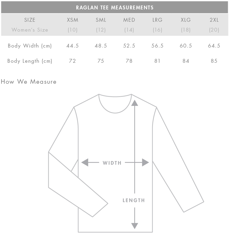 Regular fit Crew neck, length raglan sleeves, curved tails Light weight, 150 GSM, 34-singles 100% combed cotton (marles 15% viscose) Self-fabric binding on neck, side seamed, double needle hems, preshrunk to minimise shrinkage